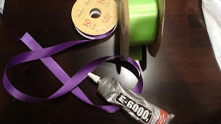 Then, turn the canvas over onto it's backside and apply the E-6000 glue to the back where you want to place the ribbon. Apply pressure to the ribbon where the glue is to ensure it sticks. I looped the ribbon on the top, so there would be a place to hide the thumb tack when you hang it on your wall or cubicle.